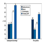 A cross-sectional study was carried out during June to September, 2012 including 1 tertiary, 3 secondary, and 3 primary level hospitals in Dhaka division, Bangladesh through 2-stage cluster sampling. Data were collected from 625 HCPs, including 245 medical doctors, 220 nurses, 44 technologists, and 116 cleaning staff who were directly involved in MWM using a self-administered (researcher-administered for cleaning staff), semi-structured questionnaire.
