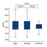 The non-dipper and dipper hypertensive groups had significantly higher MPV levels than normotensives (8.4±1 fL, 8.3±1 fL, and 8.1±0.6 fL, respectively, p<0.001). However, there was no difference among the non-dipper and dipper groups in terms of MPV level (p=0.675). Although LVMI was significantly different between non-dipper, dipper, and normotensive groups (p=0.009), no correlation was found between MPV level and LVMI in dipper and non-dipper hypertensive patients (r=–0.080, p=0.142). There was a weak correlation between MPV level and ambulatory 24-h diastolic and systolic blood pressure (r=0.076, p=0.027, and r=0.073, p=0.033, respectively).