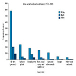 Conclusions: Salivary gland tumors were the most commonly seen head and neck tumors overall among pediatric patients between 1973 and 2008. Incidence rate differences between white, black, and other racial background pediatric patients revealed that overall, head and neck tumors are most prevalent among pediatric patients within the white ethnic population, while nasopharyngeal tumors showed a strong prevalence in blacks and other ethnic populations.