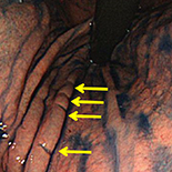 Bamboo joint-like appearance is a common yet easy-to-miss endoscopic finding in the stomach of patients with Crohn’s disease (CD). Bamboo joint-like appearance (BJA) is characterized by swollen longitudinal folds transversed by erosive fissures or linear furrows. However, whether BJA is observed during the remission stage of CD and during the active stage is unclear. In particular, the relationship between the course of BJA and anti-tumor necrosis factor (TNF) α therapy has not been studied. We aimed to evaluate the course of BJA in CD patients treated with anti-TNF α therapy.