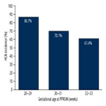 Patient age, rate of parity, tocolysis, cesarean section, serum C reactive protein (CRP) level at admission, white blood cell count, and latency duration did not significantly differ between the 2 groups. Binary logistic regression revealed that oligohydramnios at admission, gestational age at PPROM, and serum CRP >8 mg/L before delivery were significantly associated with HCA. Gestational age at delivery and birth weight were significantly lower in HCA patients than control patients. The rate of 1-min Apgar score <7, abnormal neonatal intracranial ultrasound findings, neonatal pneumonia, bronchopulmonary dysplasia, early-onset neonatal sepsis, and mortality were higher in HCA patients, but no significant difference was observed in the incidence of neonatal respiratory distress syndrome, necrotizing enterocolitis, hyperbilirubinemia, or hypoglycemia.