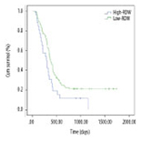 Univariate analysis showed that MCV, MCHC, and RDW were associated with overall survival (OS). However, only RDW remained significant in multivariate analysis. The Kaplan-Meier survival curves showed that patients belonging to the high-RDW group had a worse median OS (293 days versus 375 days, P=0.023) than those belonging to the low-RDW group.